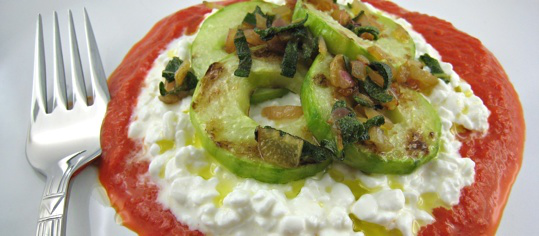 Gebratene Gurken mit Hüttenkäse auf Peperoni-Spiegel